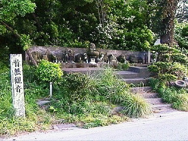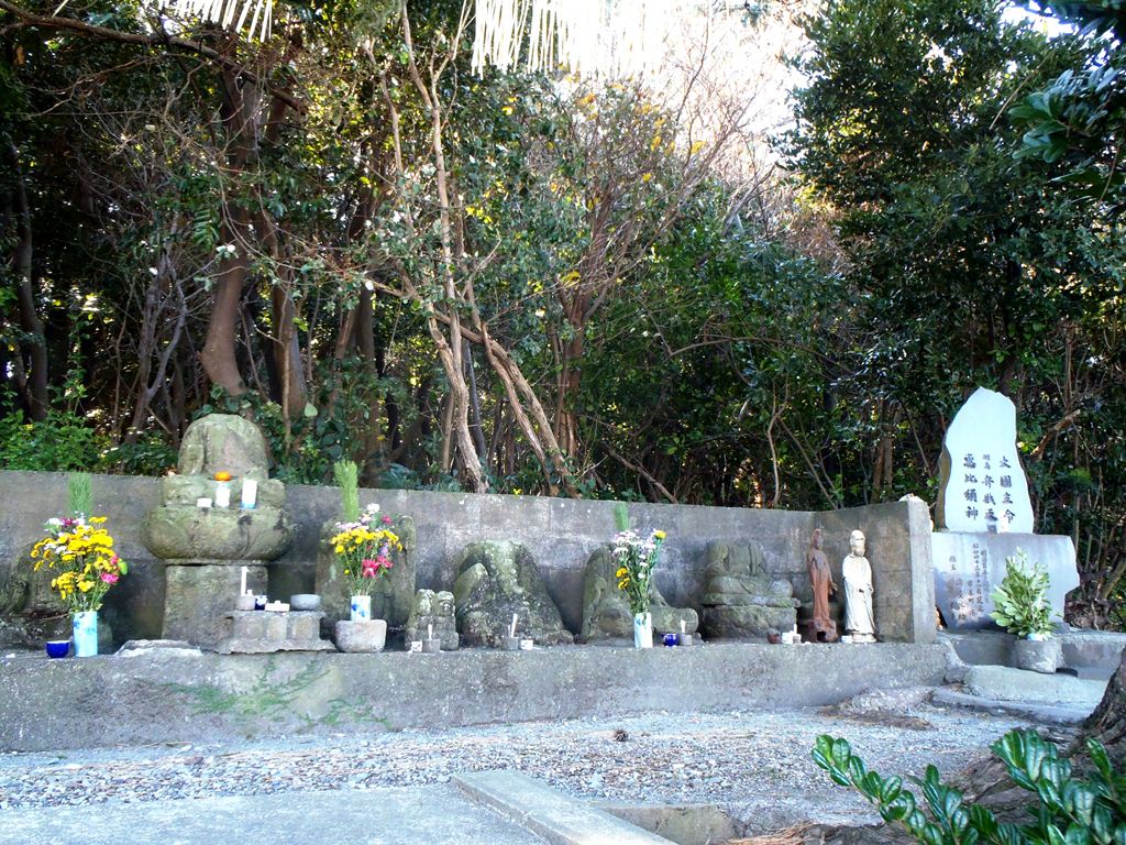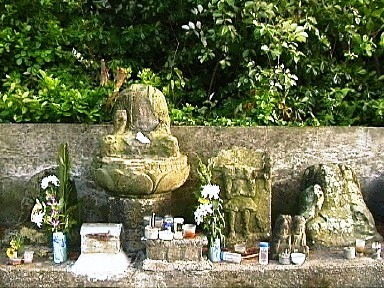明治の廃仏毀釈で壊された地蔵が、恵比須ヶ丘の墓地から、漁礁用の礎石として漁港に運ばれたものを手厚く安置したらしい。長崎鼻灯台の入り口に位置し、小瀬港の南側にあり、航海の無事と港湾の安全を見守っています。 |