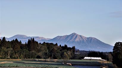 県道伊集院蒲生溝辺線、お気に入りのポイントの田園風景 遠くの山は花尾山、麓に花尾神社がある。 |