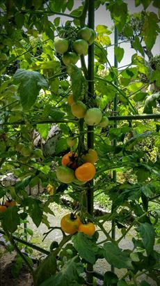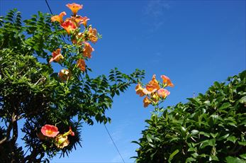 今朝は良い天気♪青空には凌霄花が似合う。 小さな庭の夏野菜を収穫する。 |